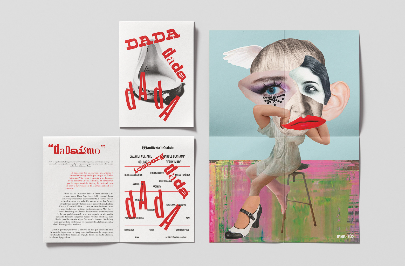 Díptico tipo fanzine sobre el Dadaísmo, acompañado de un póster en homenaje a Hannah Höch, una de sus representantes más destacadas, que refleja el estilo gráfico característico del movimiento.